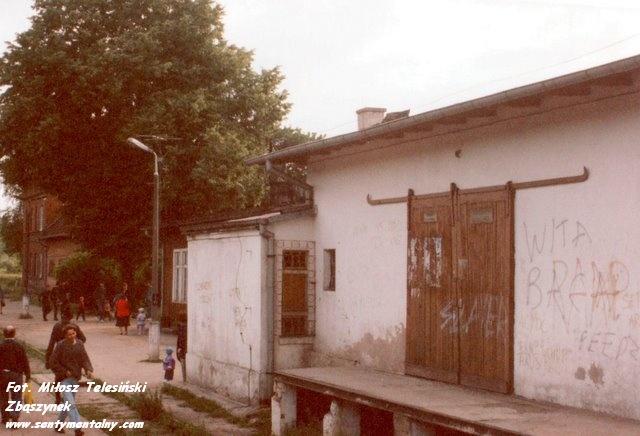 Dworzec zabity dechami na podróżnych. Widok od strony peronu; w lewo Pisz, w prawo Ełk.