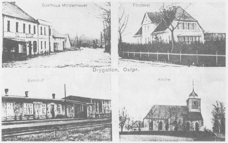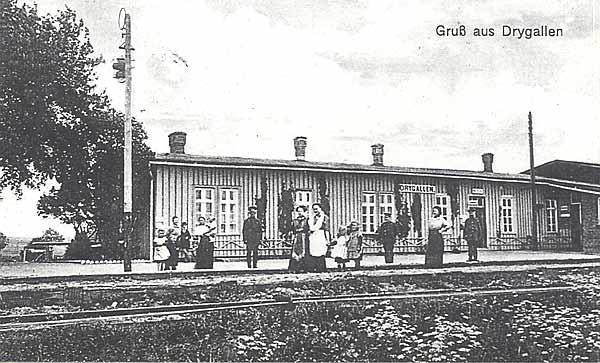 W lewym, dolnym polu budynek dworca w Drygałach. Widok od strony peronu; w lewo Pisz, w prawo Ełk.