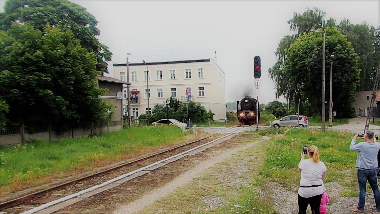 Do przystanku zbliża się pociąg specjalny prowadzony lokomotywą Pt47-65.