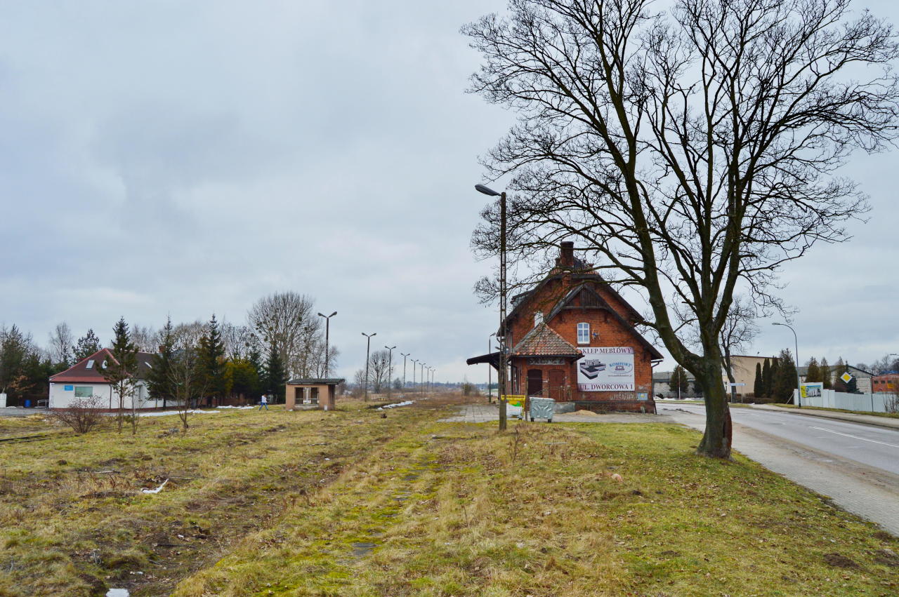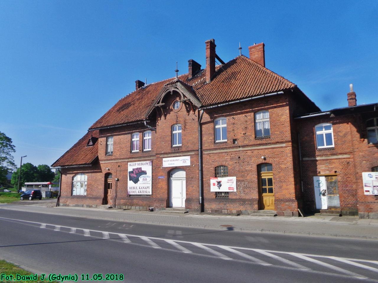 Widok na dawną stację od strony wjazdu ze Smętowa. Na wprost budynek dworca. Z lewej peron 2 i rozebrane tory. Kierunek północno-zachodni.