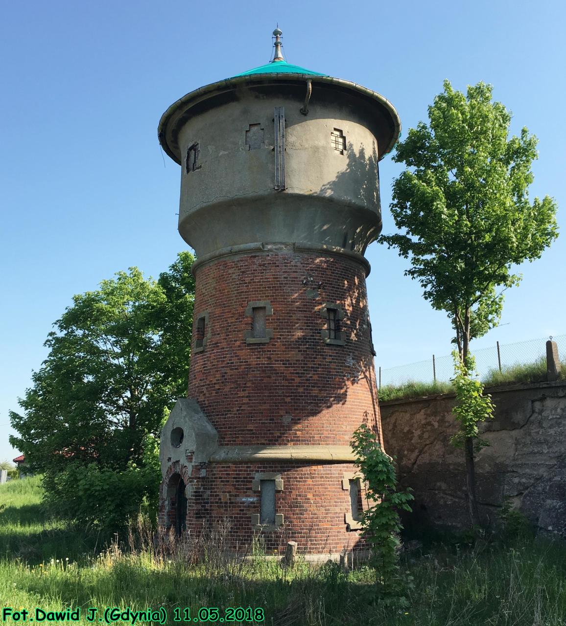 Wieża wodna w dniu 11.05.2018 r. Widok od strony rozebranych torów, w kierunku wschodnim: w prawo dworzec i perony, w lewo Starogard Gdański, Szlachta.