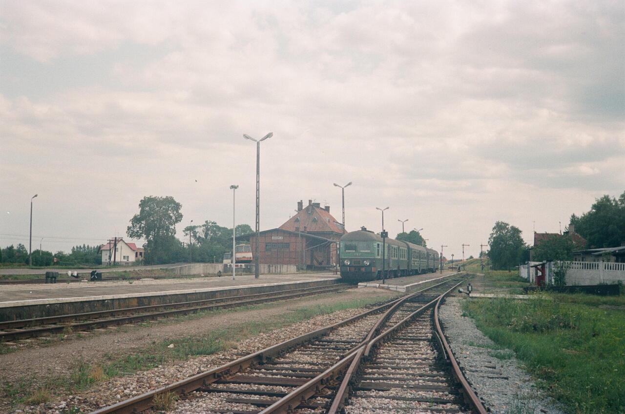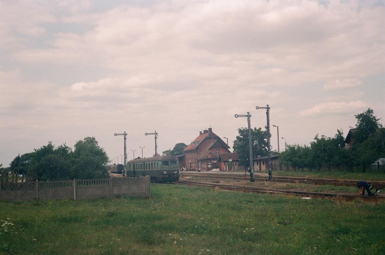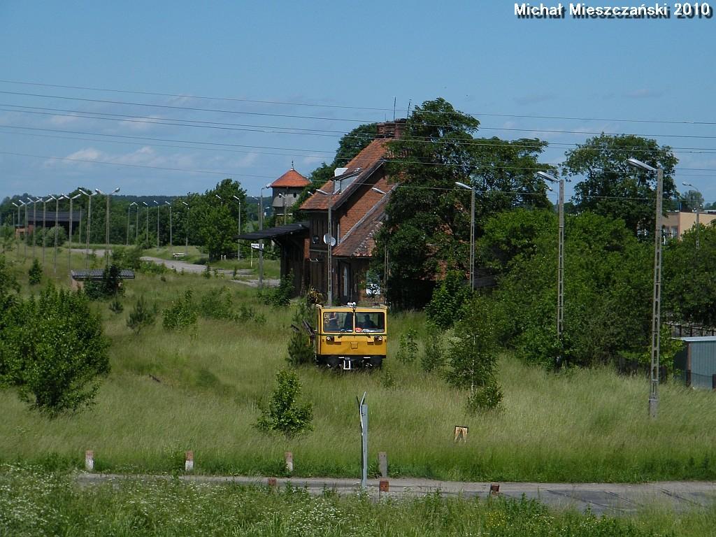 Drezyna WM15A cicho wtoczyła się w perony dworca, który niegdyś obsługiwał 3 kierunki (Szlachta, Starogard Gd., Smętowo). Na wprost budynek dworca. Za nim magazyn towarowy i wieża wodna. W tle, po lewej dawna lokomotywownia. Na pierwszym planie przejazd kolejowy przez ul. Pomorską. Widok w kierunku północnym, od strony wjazdu ze Smętowa.
