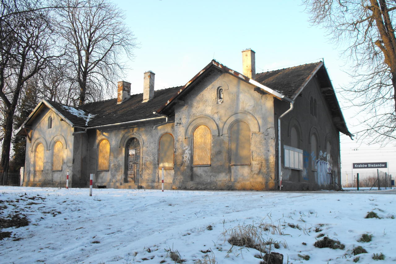 Budynek dworca PKP Kraków Bieżanów. Widok od strony peronów 1 i 2, obsługujących ruch po lk 91; w prawo Kraków Płaszów, w lewo Podłęże.