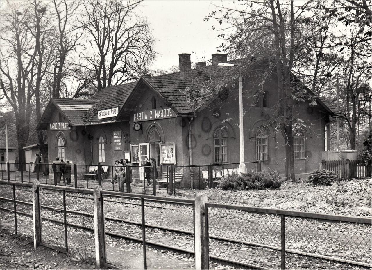 Dworzec w hasłami popagandowymi z lat 1980-tych - foro ze zbiorów p. T. Kłosa. Widok od strony peronów 1 i 2 i wjazdu z Krakowa Płaszowa.