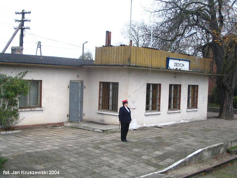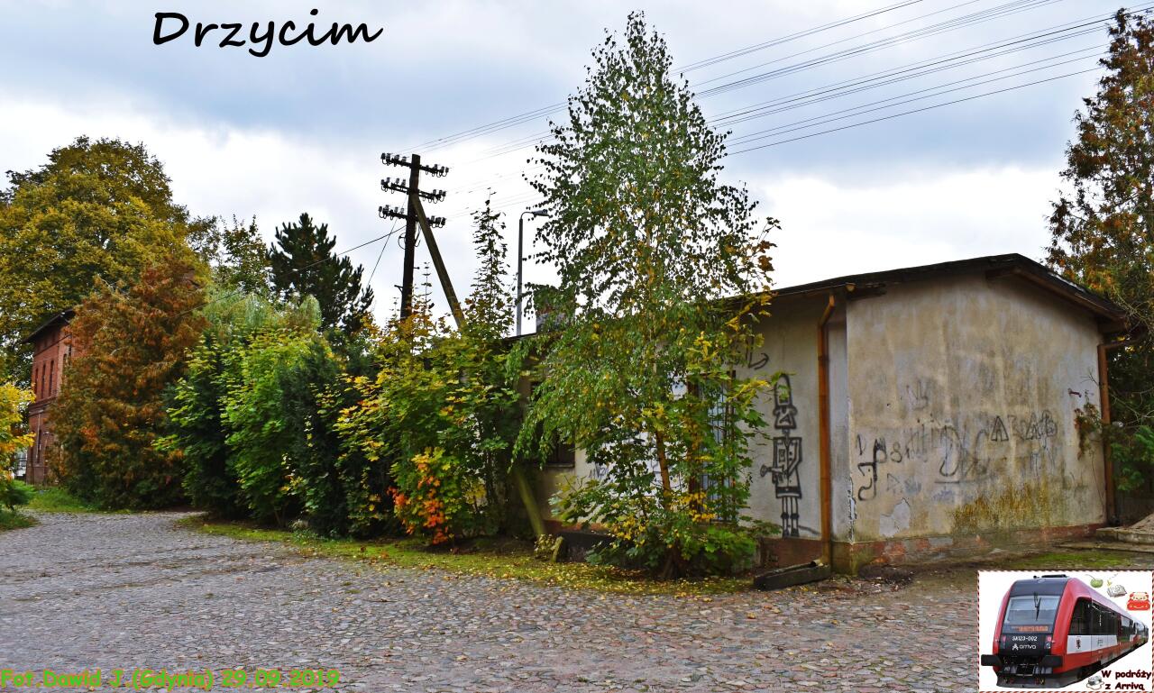 Zdewastowany budynek dworca w Drzycimiu. W wysuniętej części mieściła się nastawnia dysponująca. Na pierwszym planie puste miejsce po rozebranym torze dodatkowym. Widok od strony peronów; w lewo Wierzchucin, w prawo Laskowice Pomorskie.