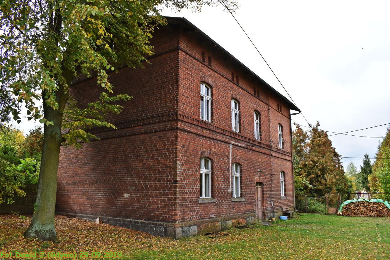 Kolejowy budynek mieszkalny (ul. Kolejowa 2) i pobliski budynek gospodarczy/budynek WC. Obiekty widoczne od strony podjazdu. Widok w kierunku Wierzchucina/Chojnic.