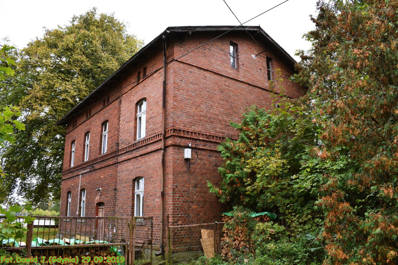 Budynek dworcowy z przyległą przybudówką po nastawni, widoczny od strony torów. Tablica informacyjna z nazwą przystanku osobowego. Kolorowa roślinność wokół budynku dworcowego sprawia pozytywne wrażenie. Widok w kierunku Laskowic Pomorskich/Działdowa.