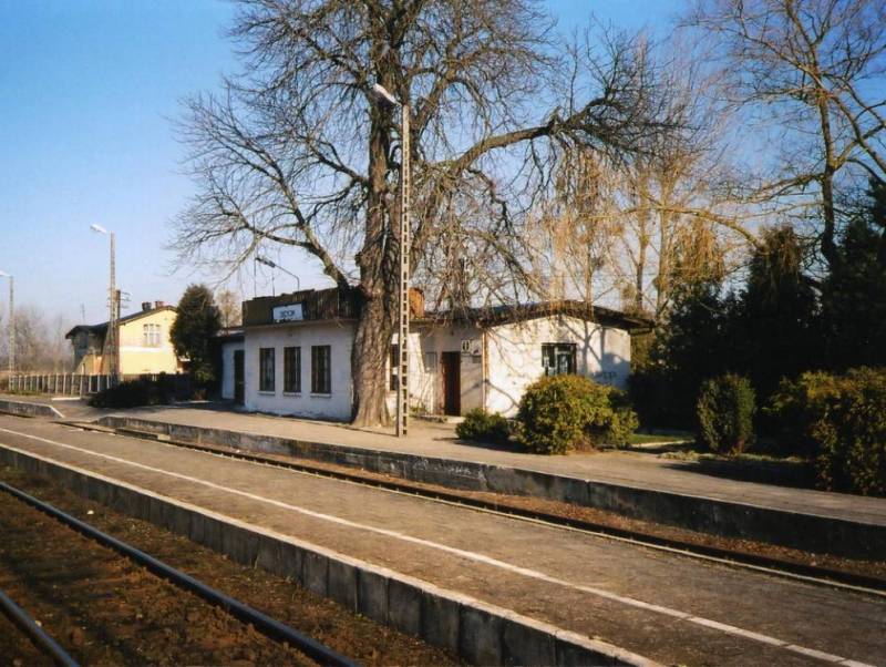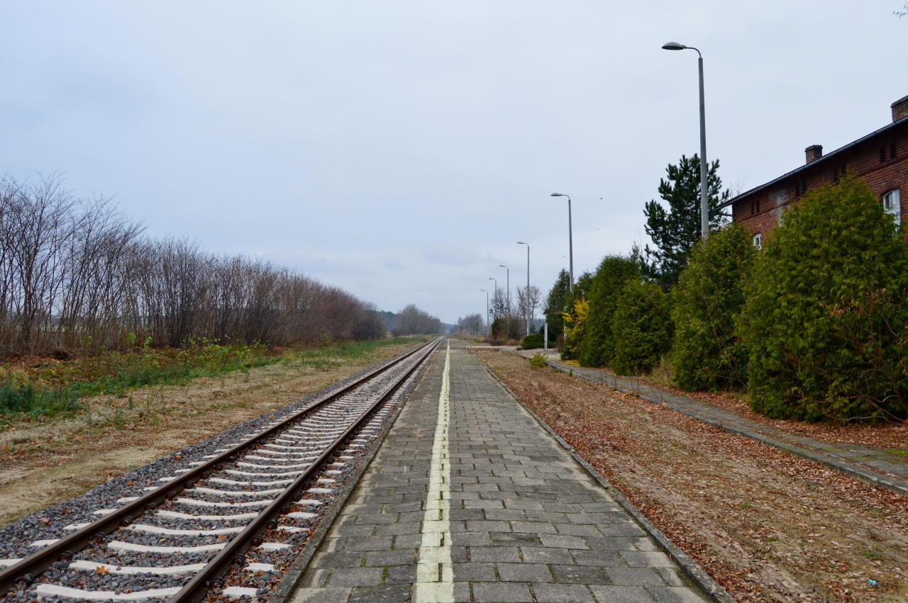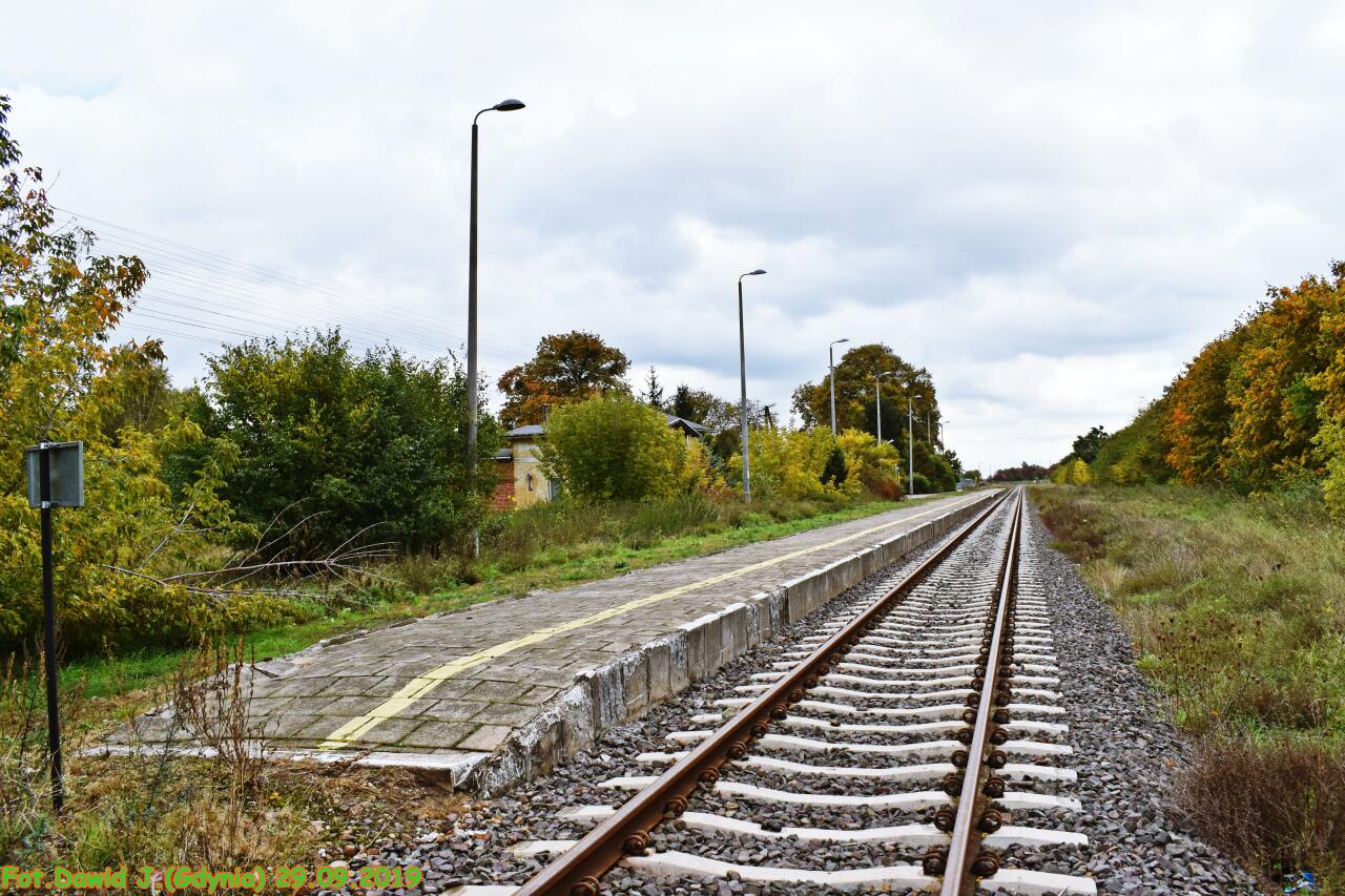 Widok na peron i w kierunku Laskowic Pomorskich/Działdowa. Kolejowy budynek mieszkalny (ul. Kolejowa 23) znajduje się po lewej stronie.