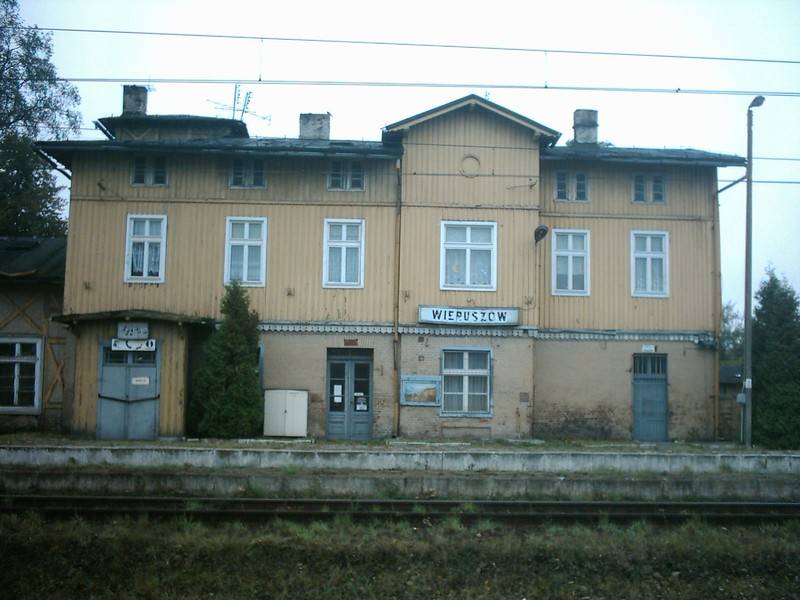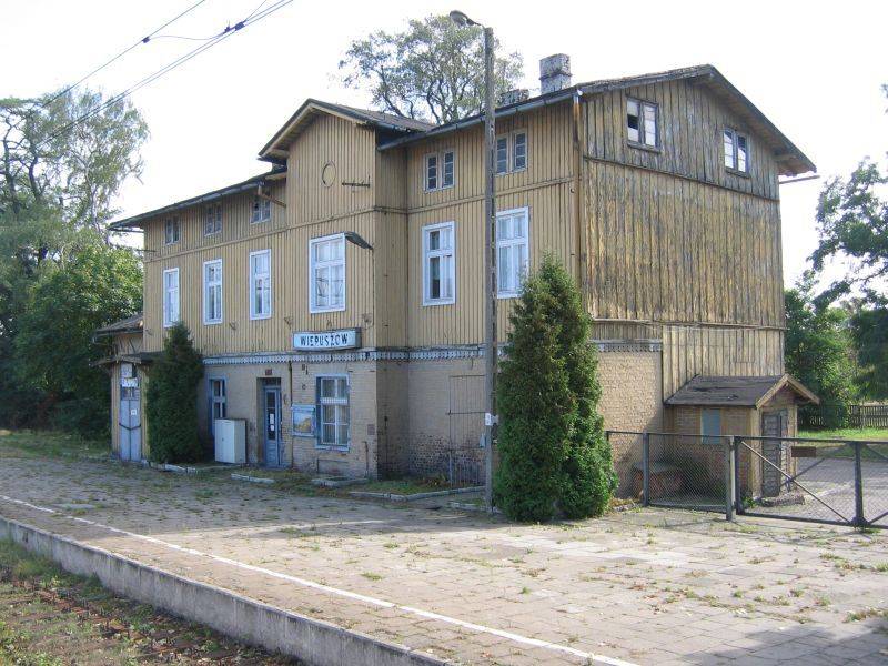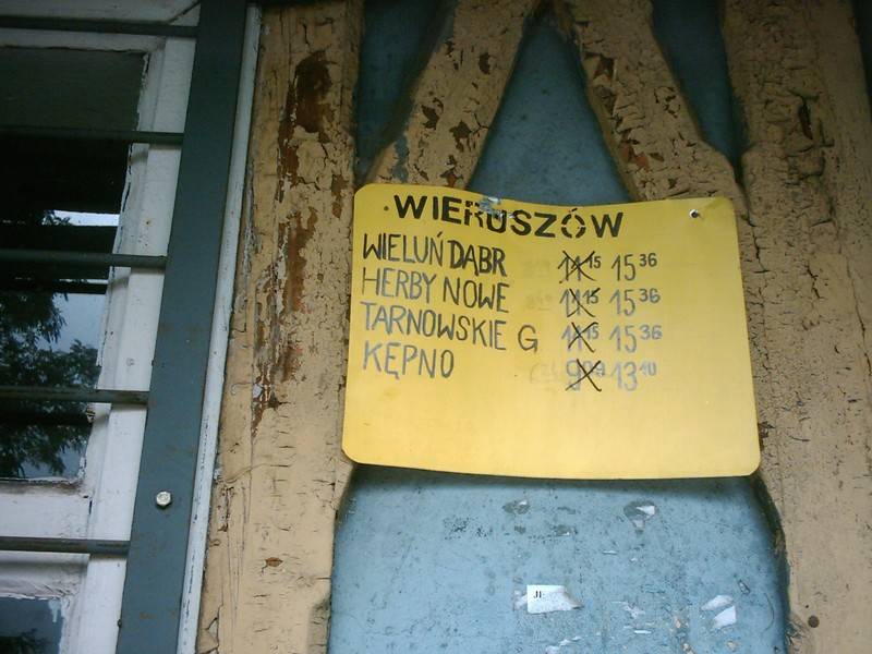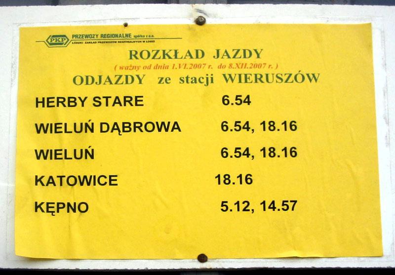 Stacja PKP Wieruszów. Od 1 czerwca 2007 roku powróciły na tę stację pociągi. Na drzwiach budynku dworcowego dostępny jest rozkład jazdy.