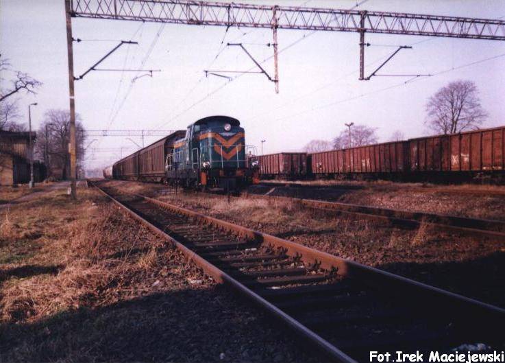 Pociąg zdawczy z pustymi wagonami do fabryki płyt wiórowych.