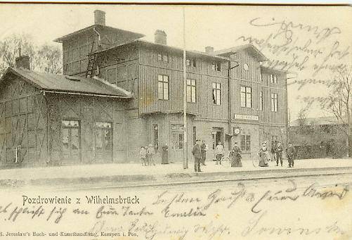 Pocztówka przedstawiająca dworzec w ówczesnym Podzamczu (Wilhelmsbrueck), wysłana 15 lipca 1902 r. z pociągu relacji Oleśnica-Podzamcze.