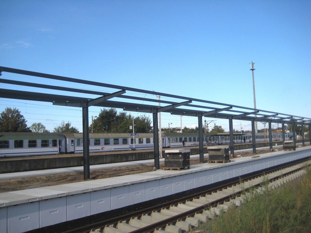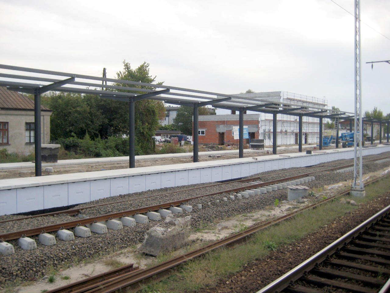 Stacja Łowicz: wszystkie tory zniesione ale stoją bramki nad pustą przestrzenią.