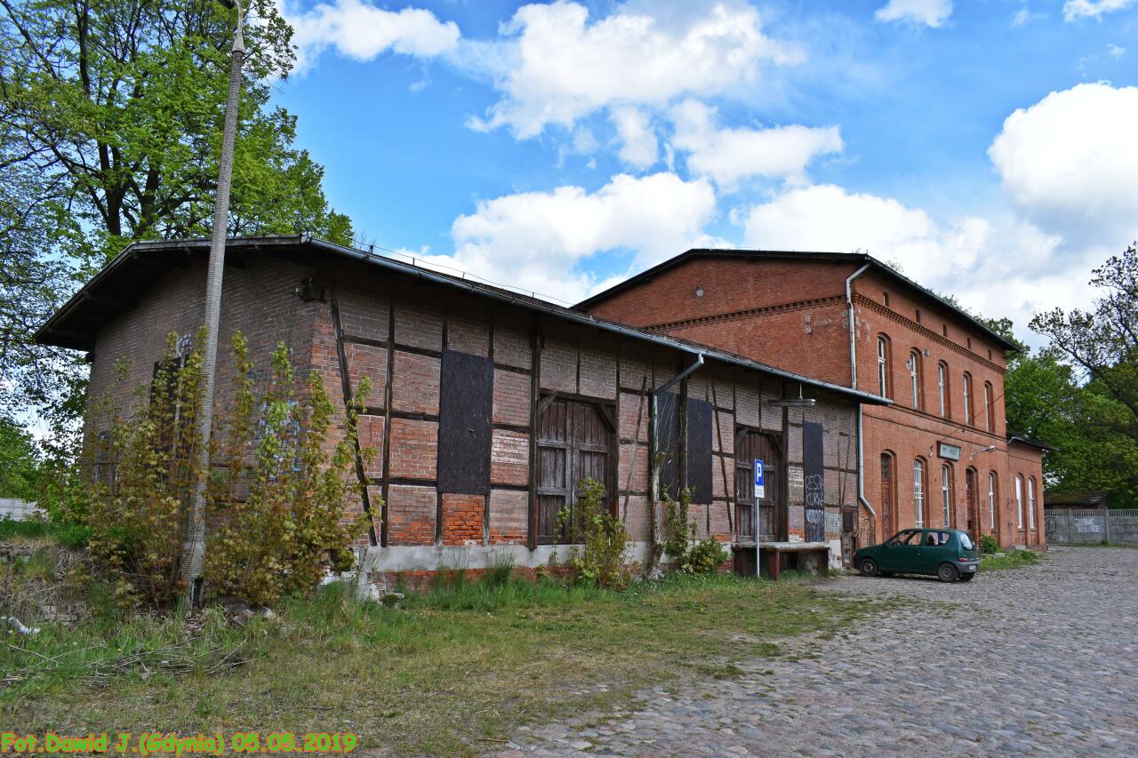 Budynek dworcowy z przyległym budynkiem magazynu, widoczny od strony podjazdu. Widok w kierunku Jabłonowa Pomorskiego/Działdowa.