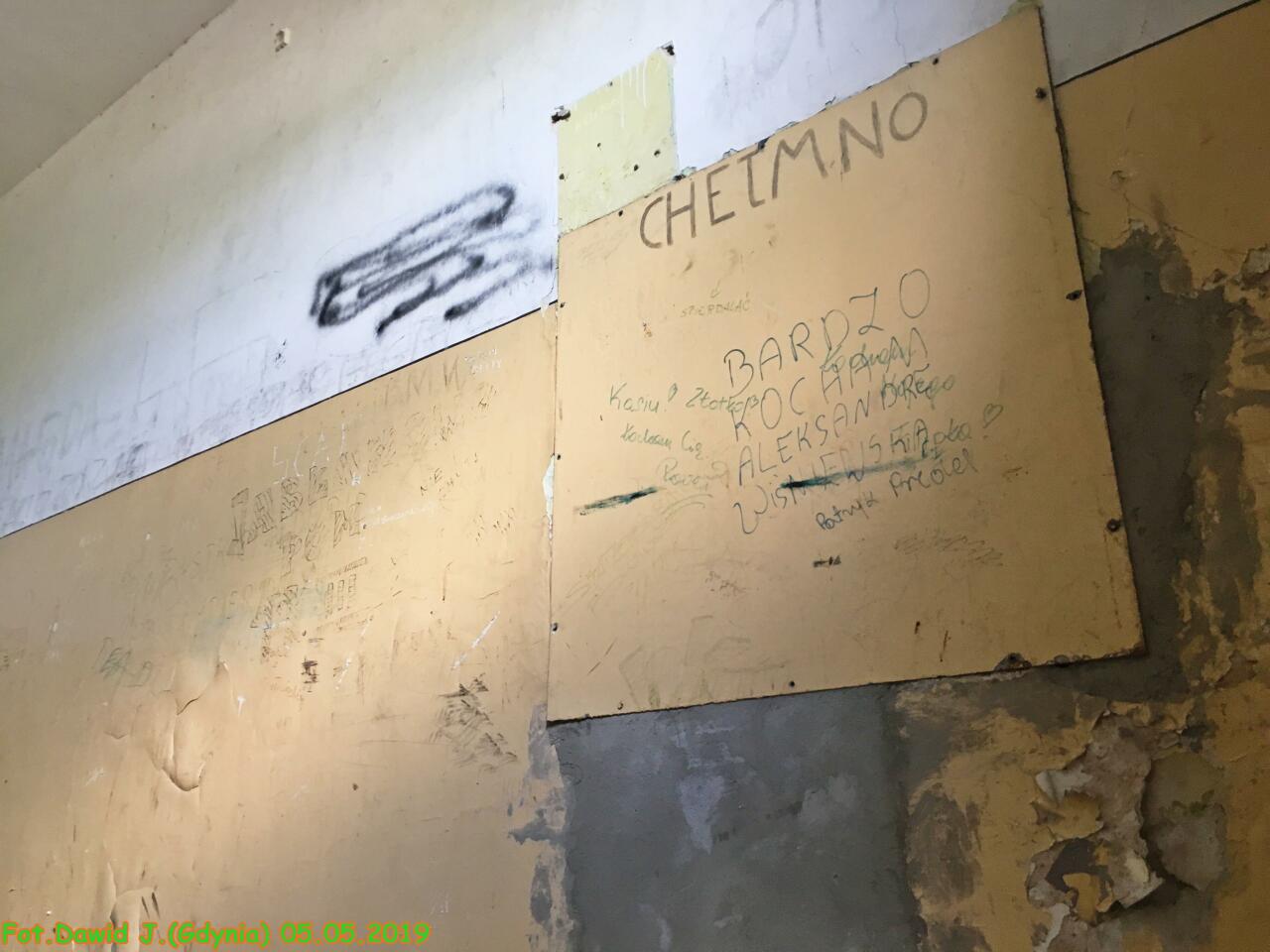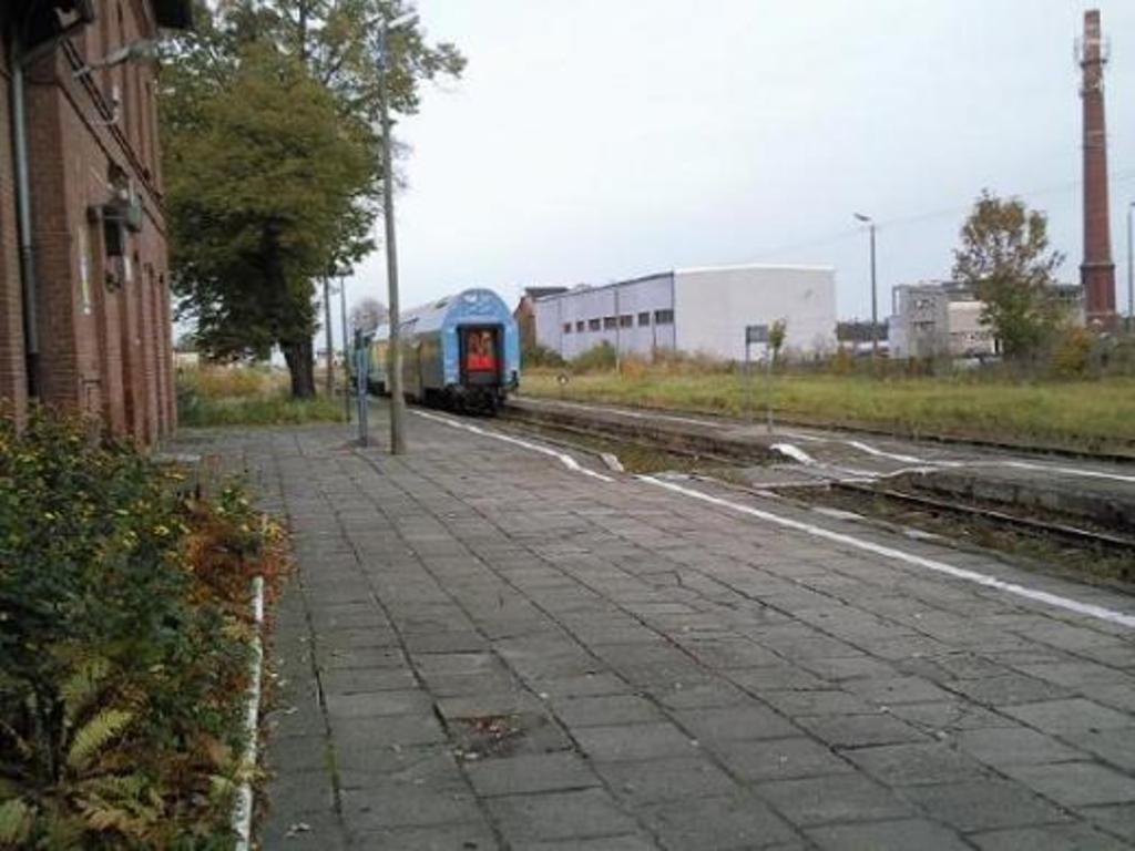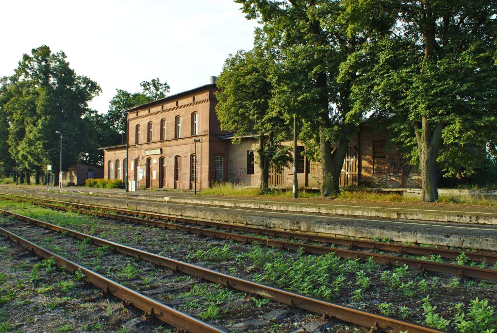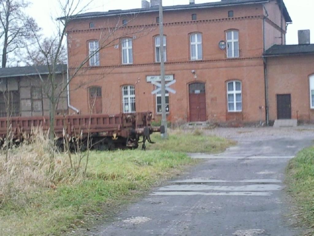 Widok od podjazdu do budynku stacyjnego, przed laty z tej strony stacji przebiegała linia do Chełmży. Na resztkach torowiska widoczny wagon.