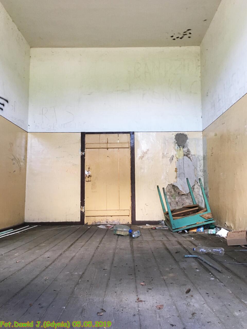 Wnętrze budynku dworcowego. Nieczynna poczekalnia dla podróżnych. Pozostałości po okienku informacji lub kasy bagażowej.