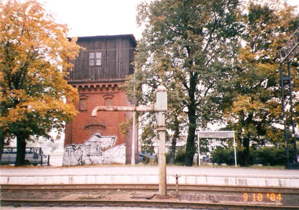 Włocławek. Wieża wodna i żuraw wodny, widok z peronu. Z prawej (poza kadrem), w lewo Aleksandrów Kujawski/Toruń.