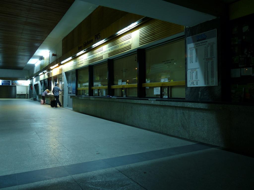 Na pierwszym planie kasy biletowe PKS na drugim PKP.
