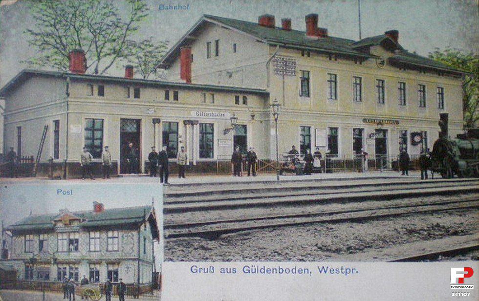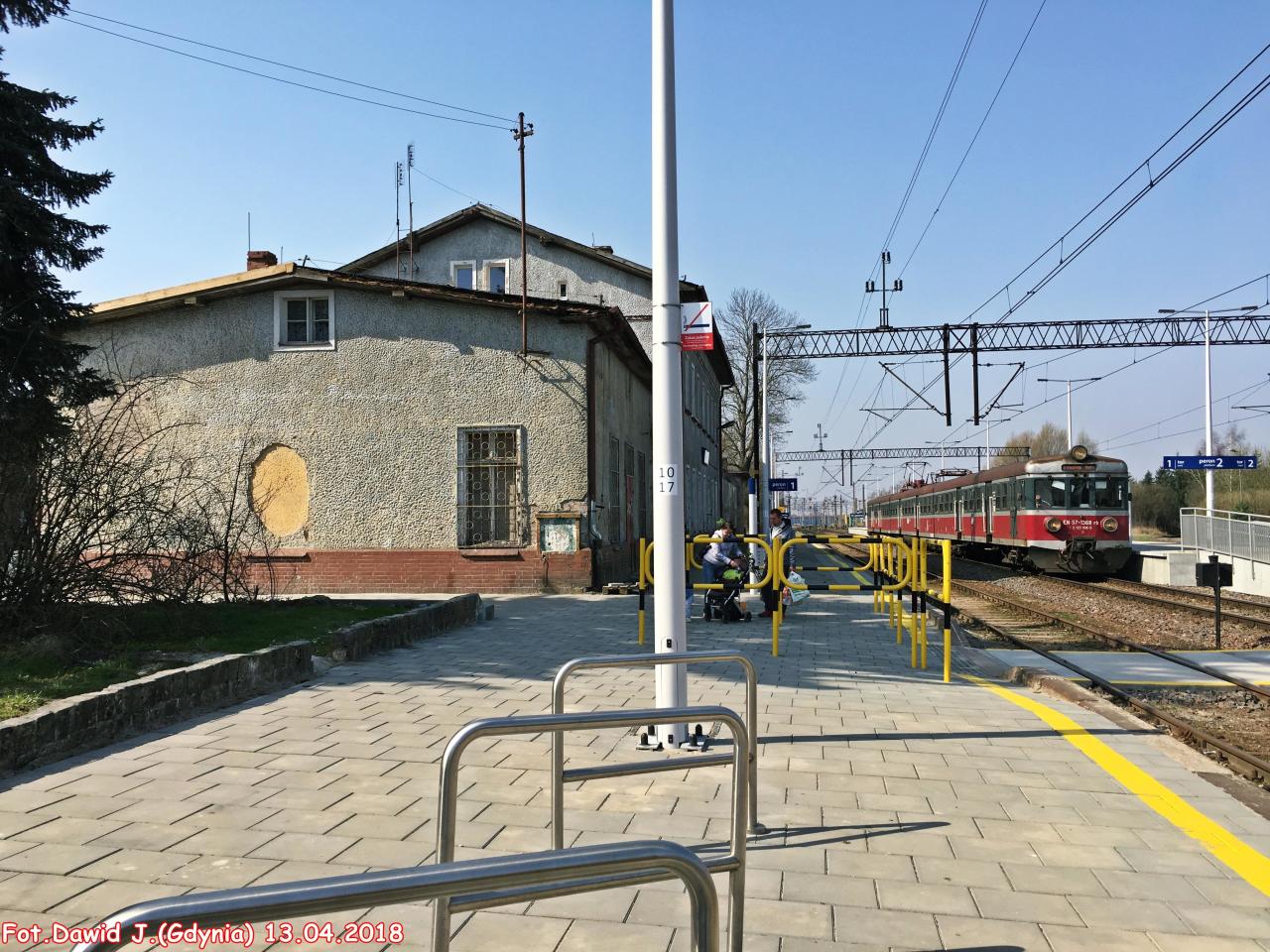 Peron pierwszy, boczny (po prawej) i peron drugi, wyspowy. Widoczny budynek dworcowy od strony peronów. Widok w kierunku Braniewa i Morąg. 41,2 km/ 85,3 km.