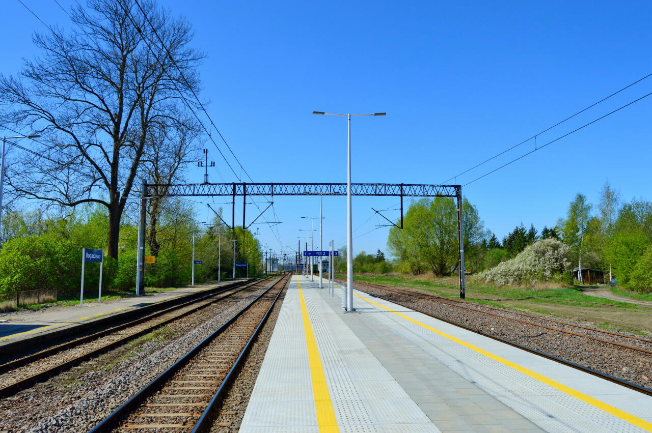 Bogaczewo. Widok z peronu 2 w kierunku Elbląga. Po lewej stronie peron 1, w oddali budynek nastawni "Bc".