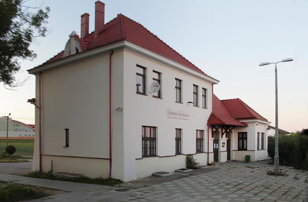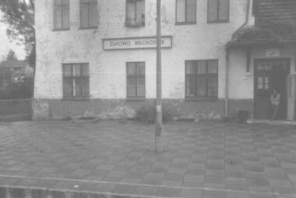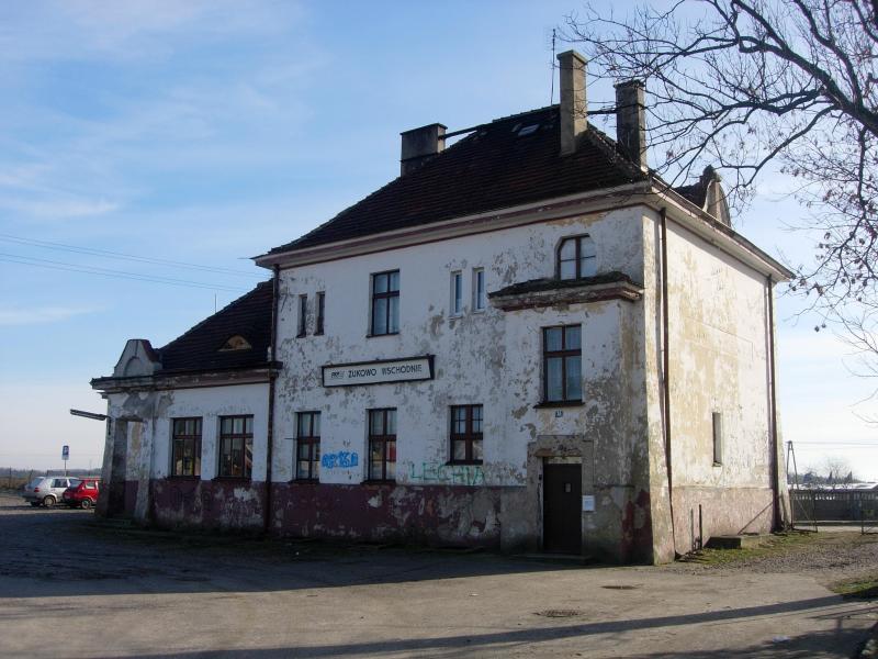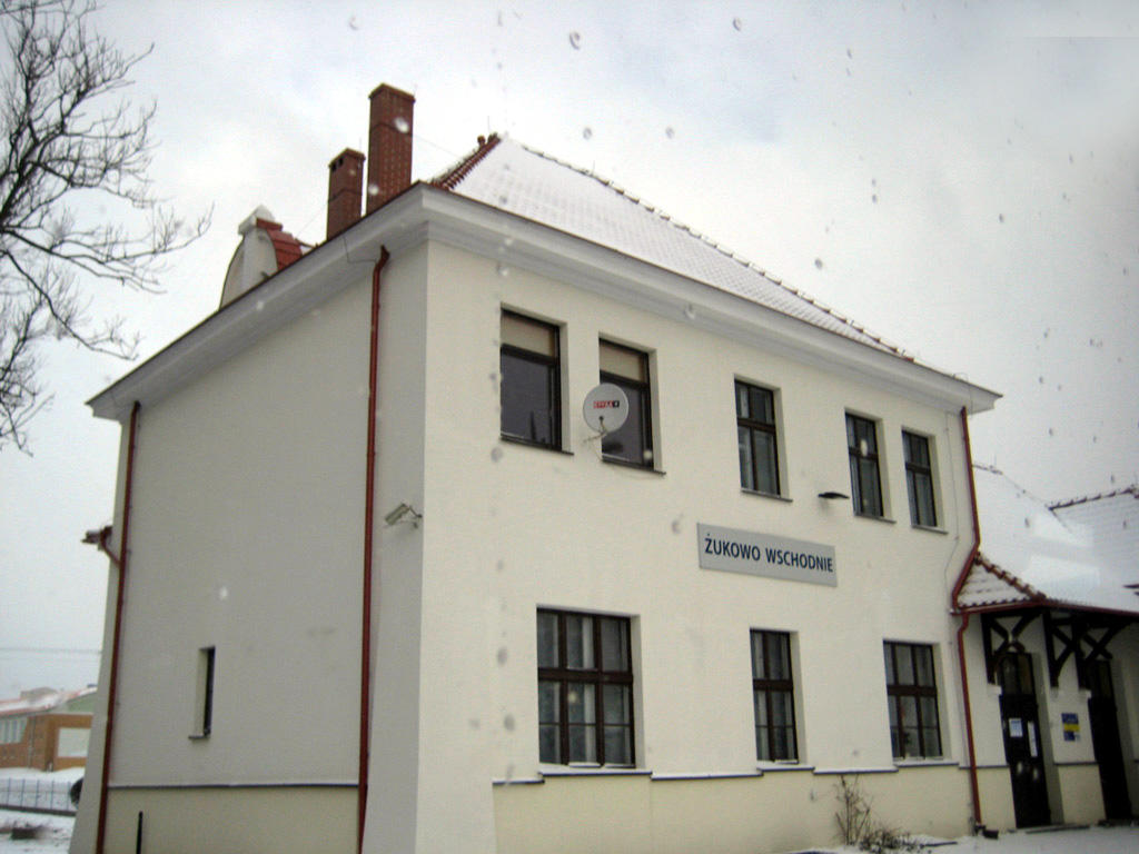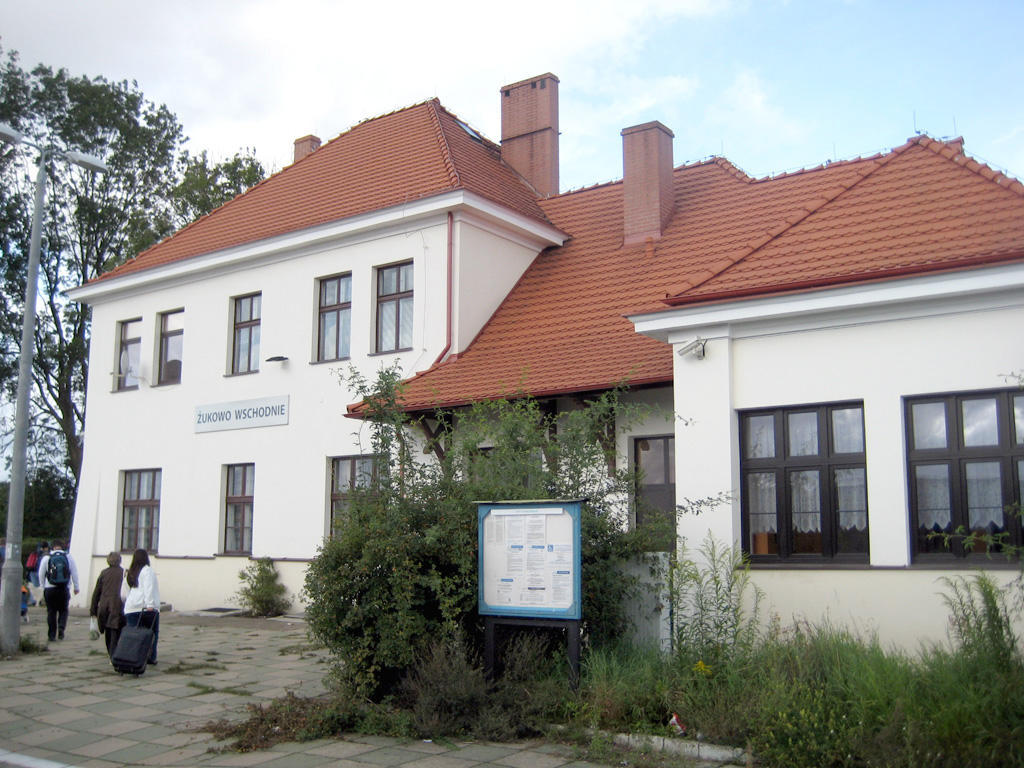 Żukowo Wschodnie oraz sympatyczny budynek stacyjny. Widok w kierunku południowo-zachodnim (Glincz).