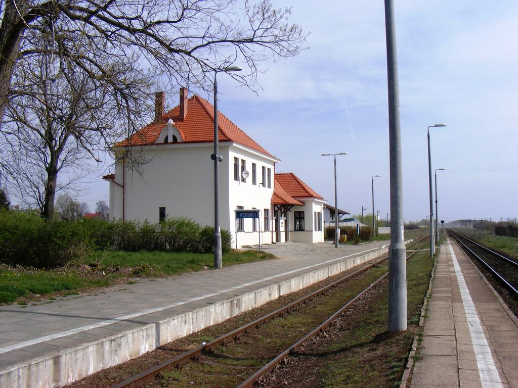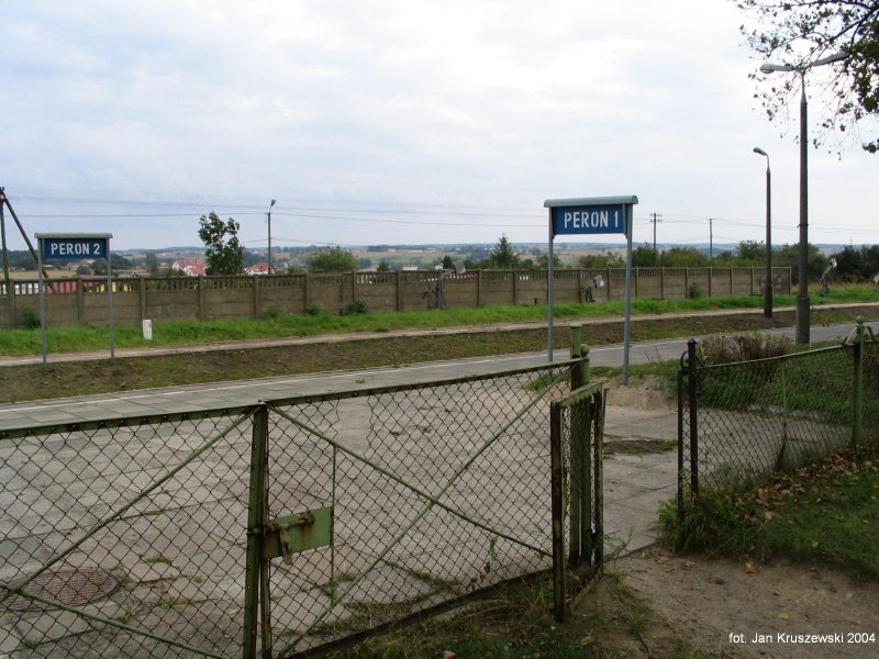 Widok na peron i fragment budynku dworca w kierunku północno-zachodnim; w lewo Glincz, w prawo Rębiechowo.