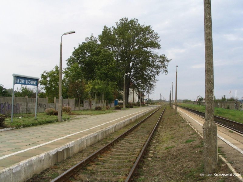 Żukowo Wschodnie. Widok na peron i budynek dworca w kierunku północno-wschodnim.