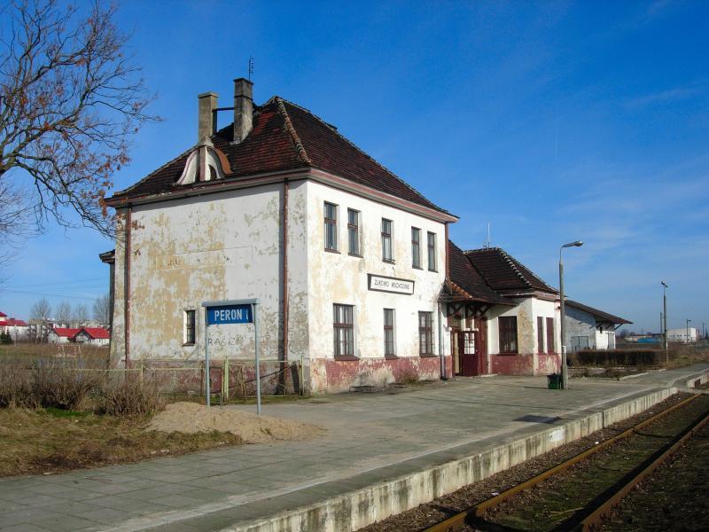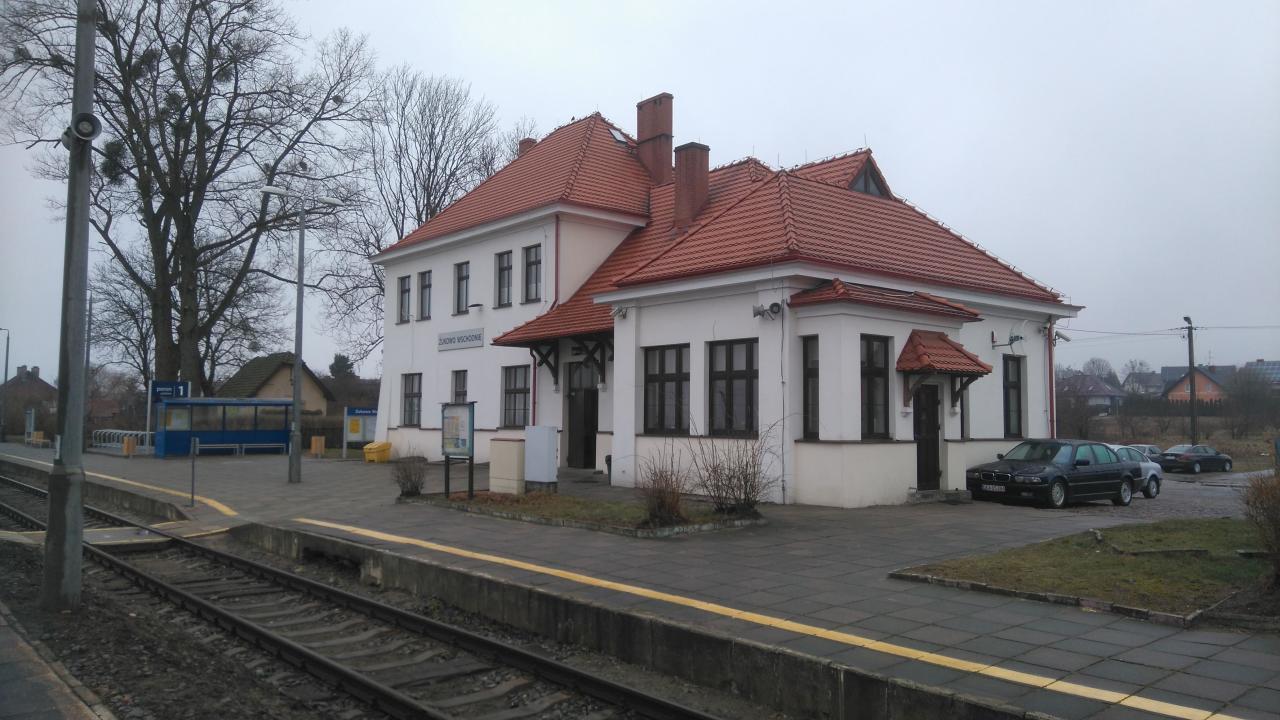 Widok na peron i budynek dworca w kierunku północno-wschodnim (Rębiechowo).
