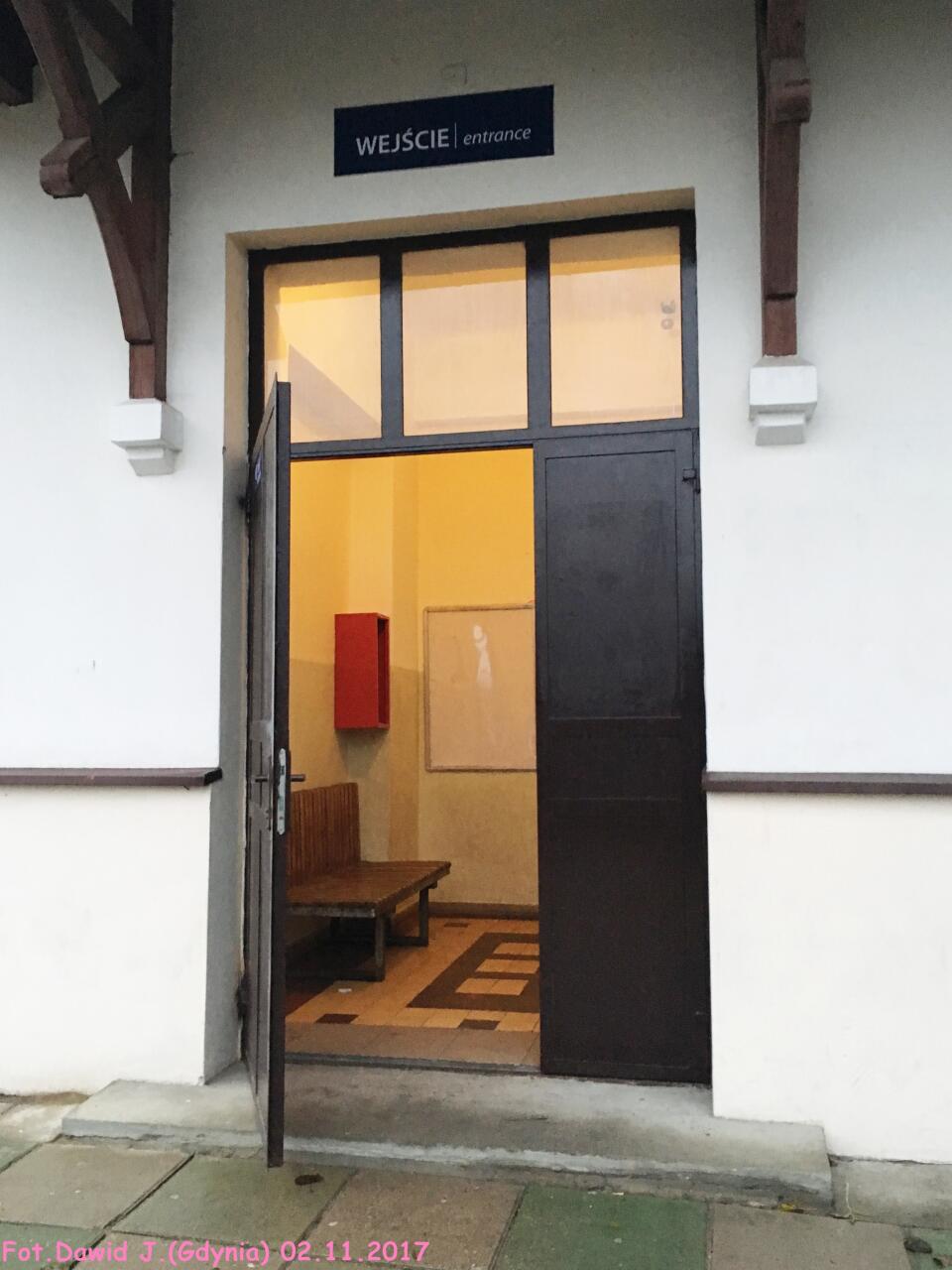 Budynek dworcowy widoczny od strony podjazdu. W budynku pojawiło się biuro firmy "Albatros" świadczącej usługi przewozowe w gminie Żukowo, a miejsce poczekalni jest w małym pomieszczeniu. Widok w kierunku Żukowa (przystanku osobowego)/Bydgoszczy Głównej.
