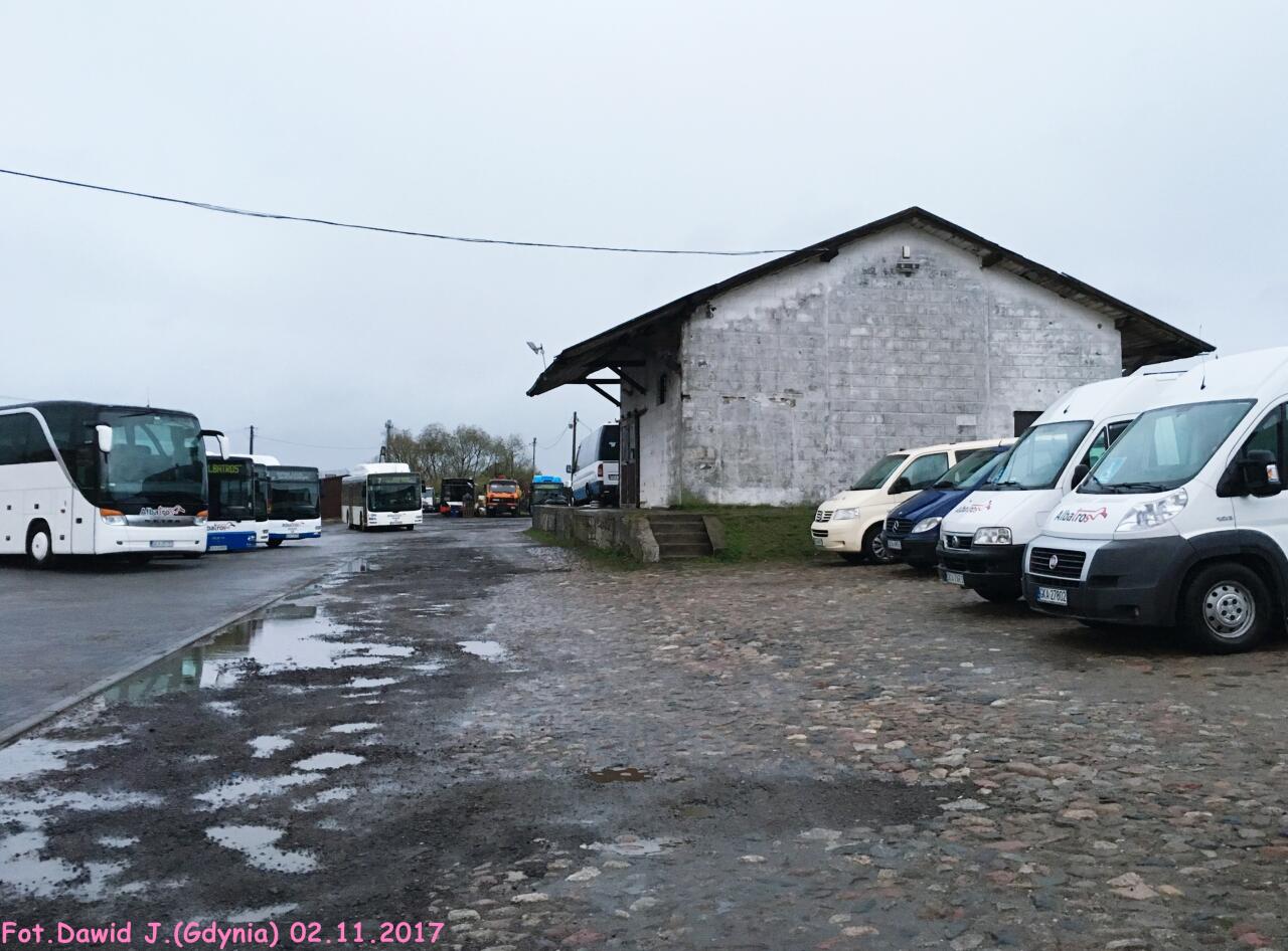Budynek magazynu widoczny od strony podjazdu. Pojazdy firmy "Albatros" świadczącej usługi przewozowe w gminie Żukowo. Widok w kierunku Gdańska Osowej/Gdyni Głównej.