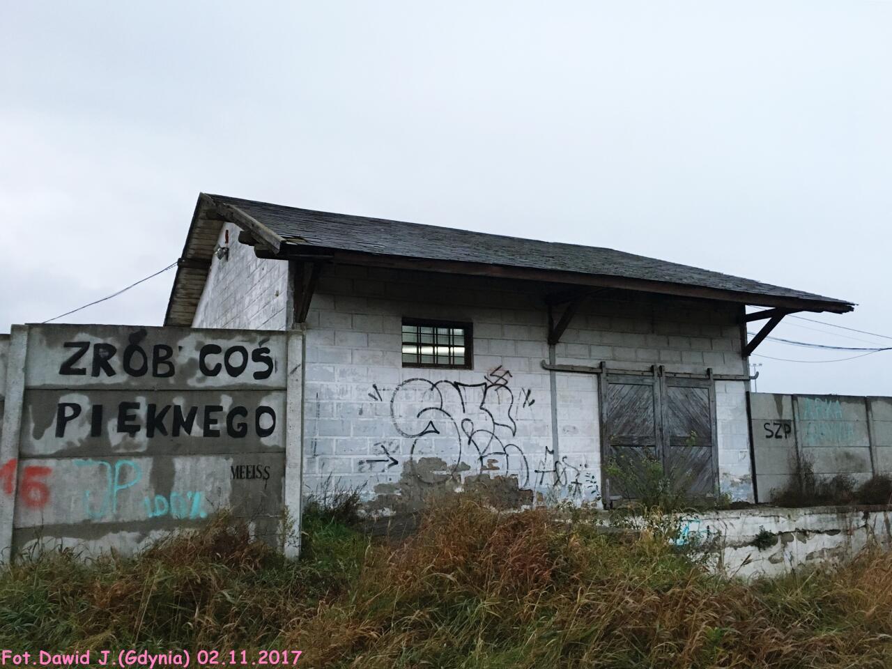 Budynek magazynu widoczny od strony torów. W lewo Żukowo (przystanek osobowy)/Bydgoszcz Główna, w prawo Gdańsk Osowa/Gdynia Główna.