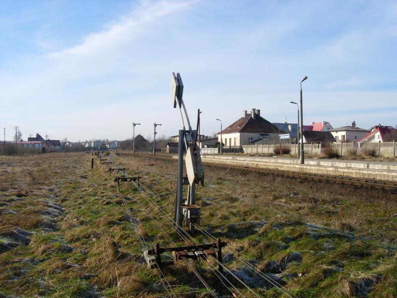 Zachodnia głowica stacji. Żukowskie naprężacze dla semaforów kształtowych, w tle semafory wyjazdowe na Kościerzynę.