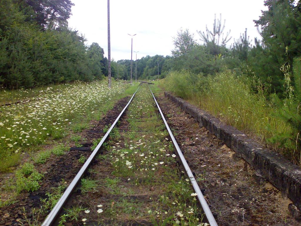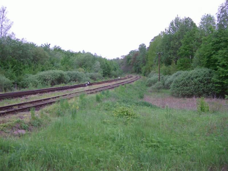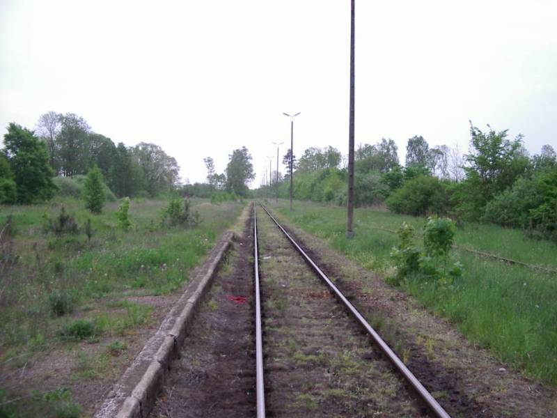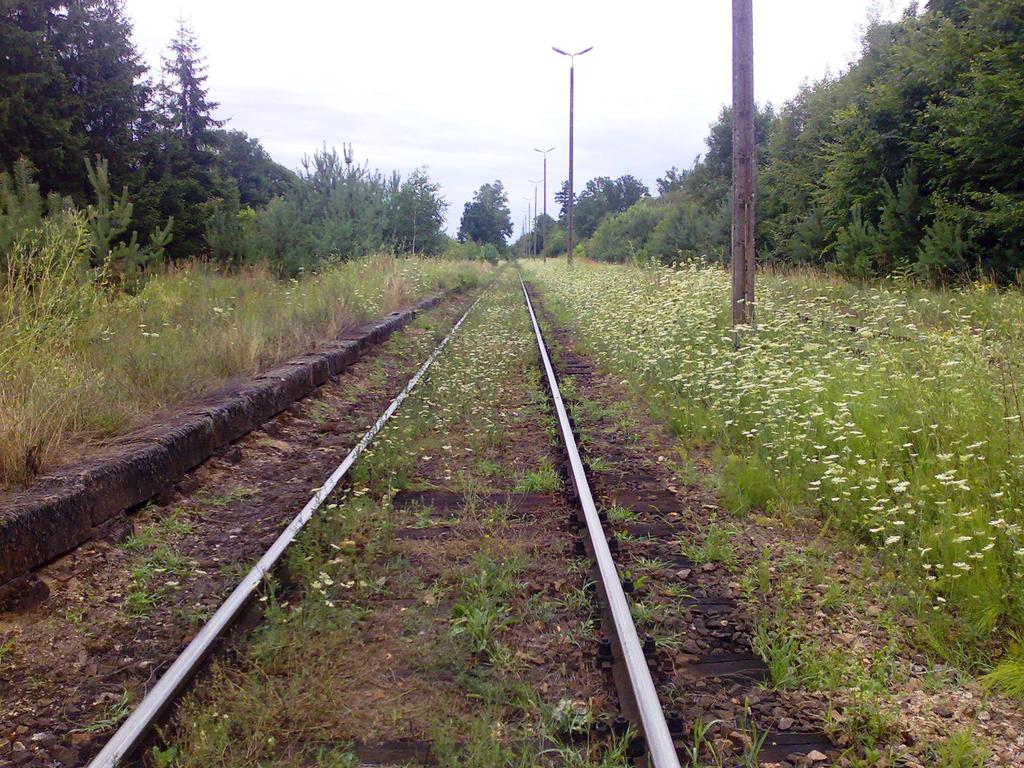 Zarośnięty peron przed dawny dworcem. Widok od strony wjazdów ze Sławy Wielkopolskiej i bazy paliw.