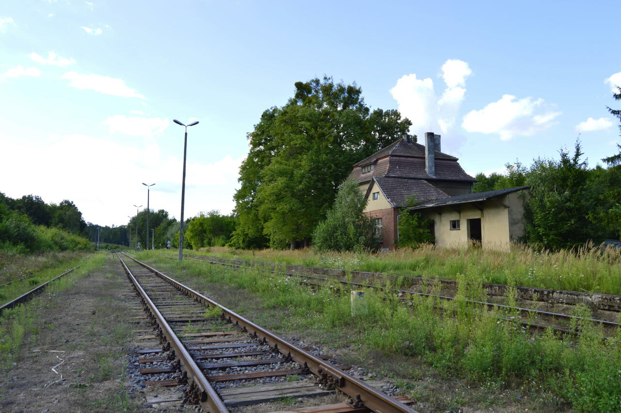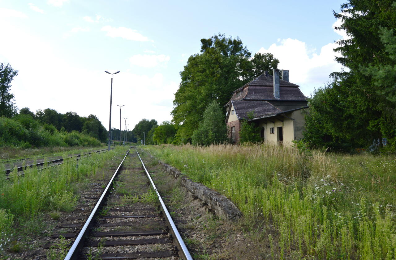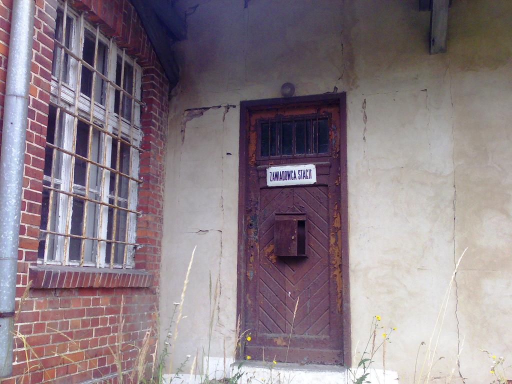 Dawny dworzec kolejowy, wejście do nieczynnej nastawni dysponującej. Wg relacji mieszkańca dworca, ostatni skład pasażerski przejechał tędy ok. 1994 r.
