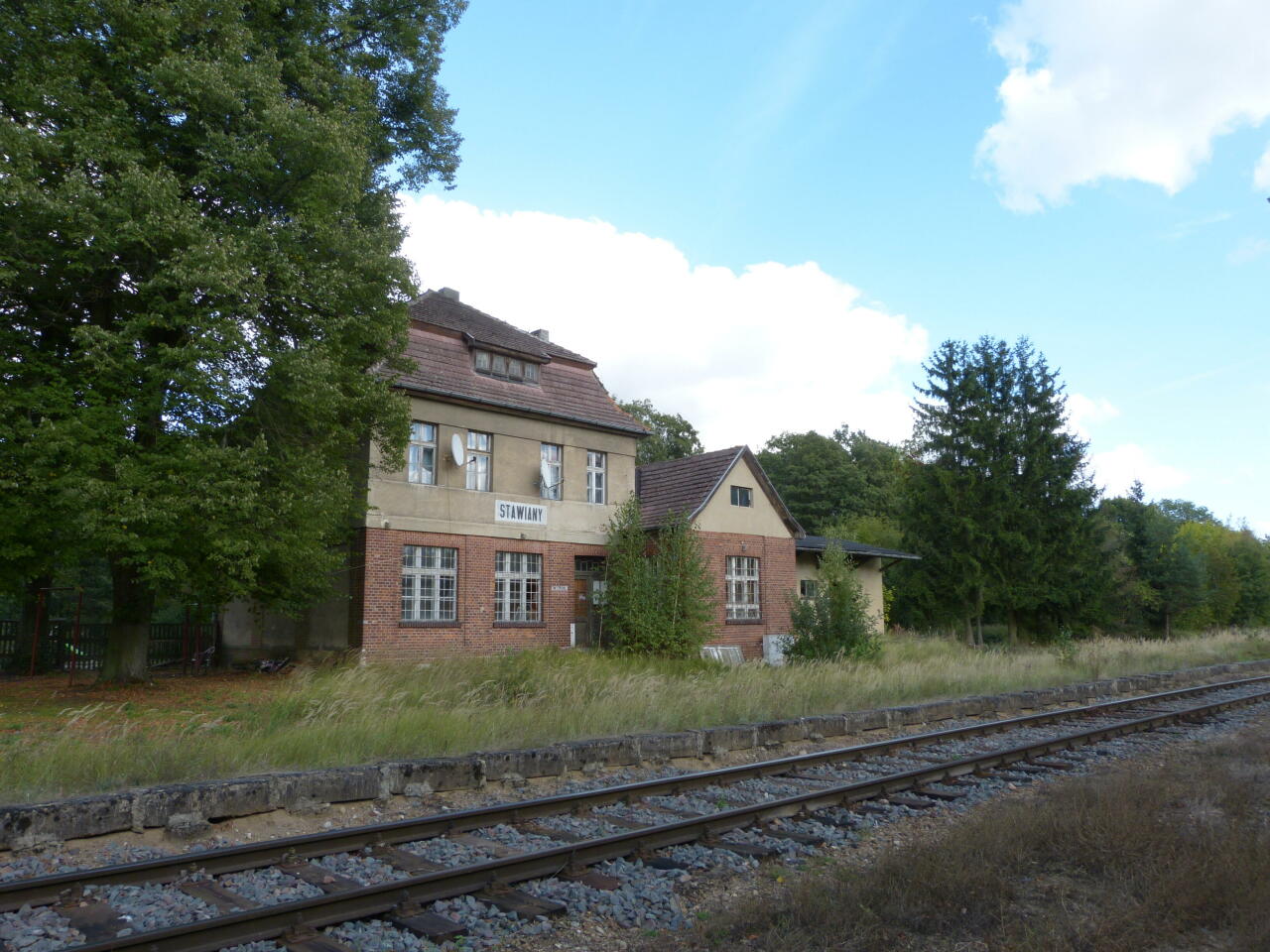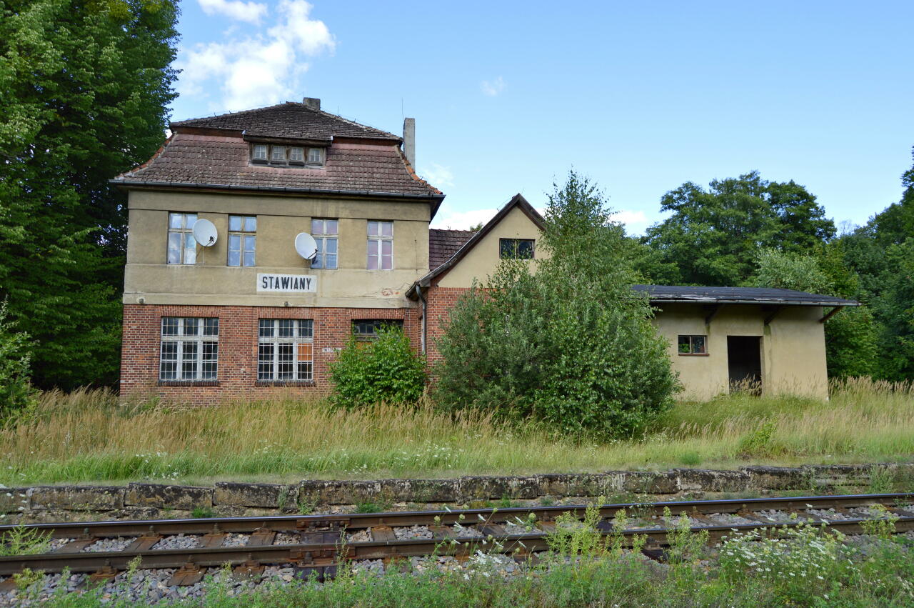 Stawiany. Dawny budynek dworca od strony peronów. W przybudówce, na parterze mieściła się nastawnia dysponująca. W lewo Sława Wielkopolska i bazy paliw, w prawo Gniezno.