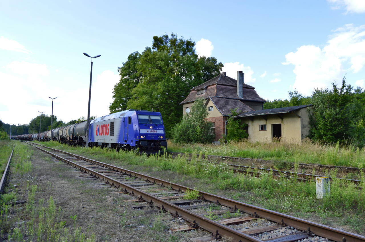 Z prawej krawędź peronowa. Widok od strony wjazdów ze Sławy Wielkopolskiej i bazy paliw.