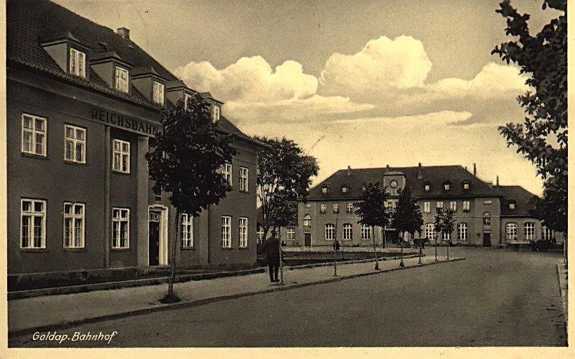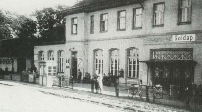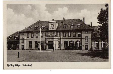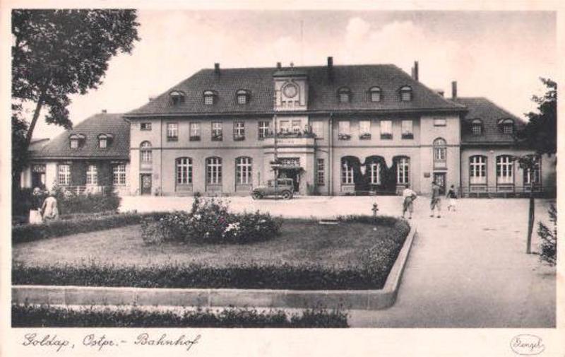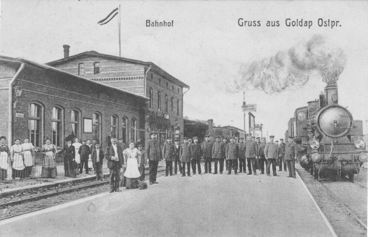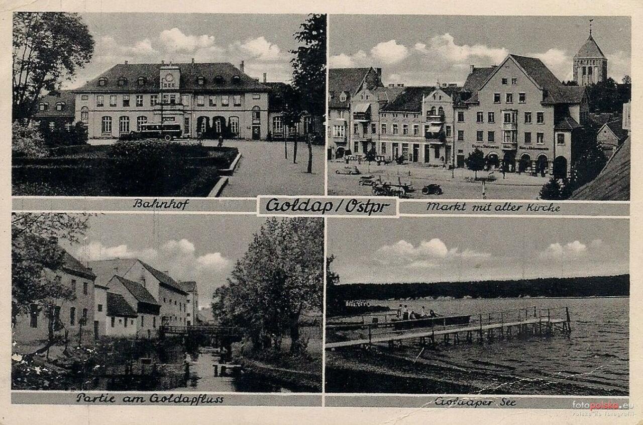 Gołdap na dawnej pocztówce. Na pierwszym polu dworzec.