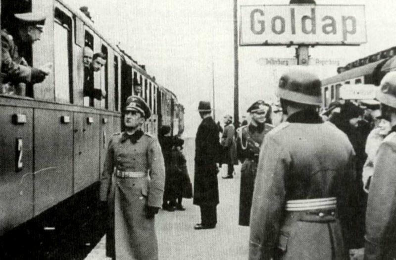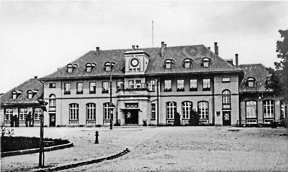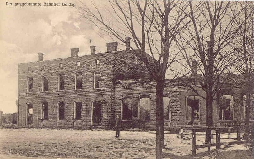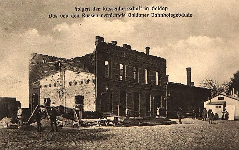 Zniszczony w czasie działań wojennych dworzec w Gołdapi.