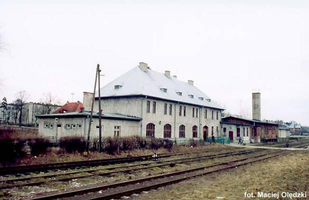 Widok na budynek dworca, magazyn towarowy i peron od strony wjazdów z Ełku i Giżycka (rozebrany).