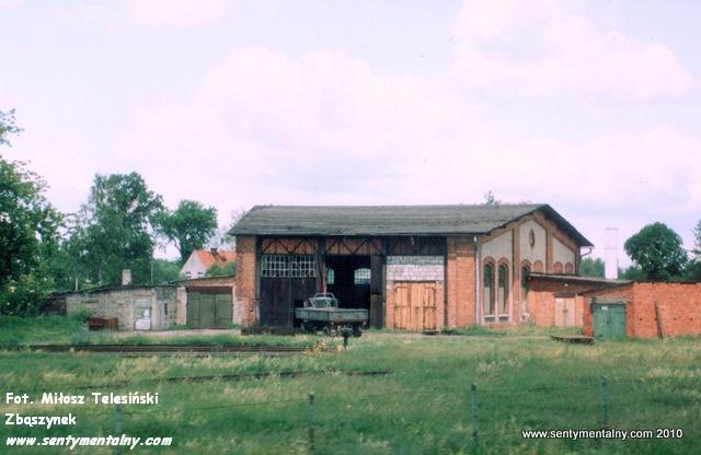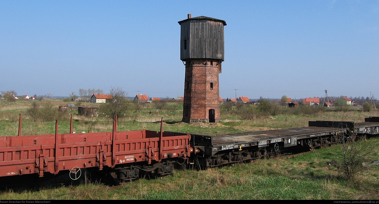 W głębi majaczą relikty części trakcyjnej - wieża wodna i parowozownia.