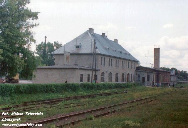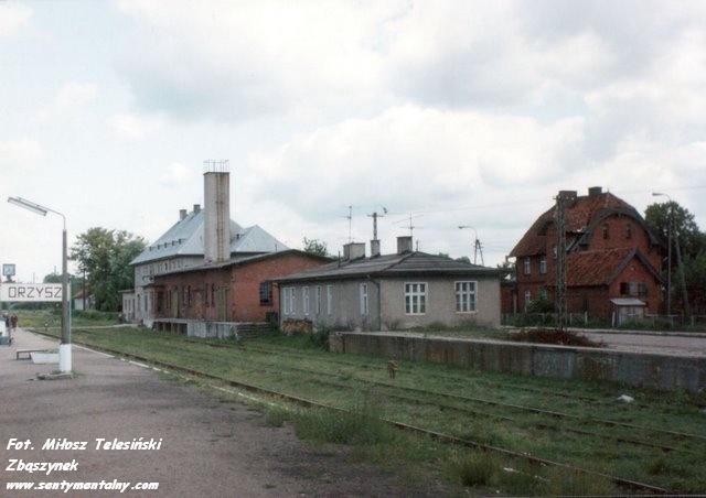 Stacja Orzysz w dniu 18.06.1993 roku. Widok na budynek dworca i peron od strony wjazdów z Ełku i Giżycka (rozebrany).