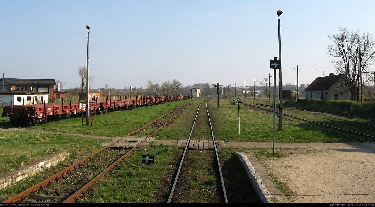 Z prawej długa rampa boczna zamknięta zespołem dworca od północy i nastawnią Or1 od południa, z domami kolejowymi widocznymi w dwóch oddzielnych skupiskach. Od skrajnego toru z prawej poza kadrem odgałęzia się dojazd do grupy torów rampy wojskowej.