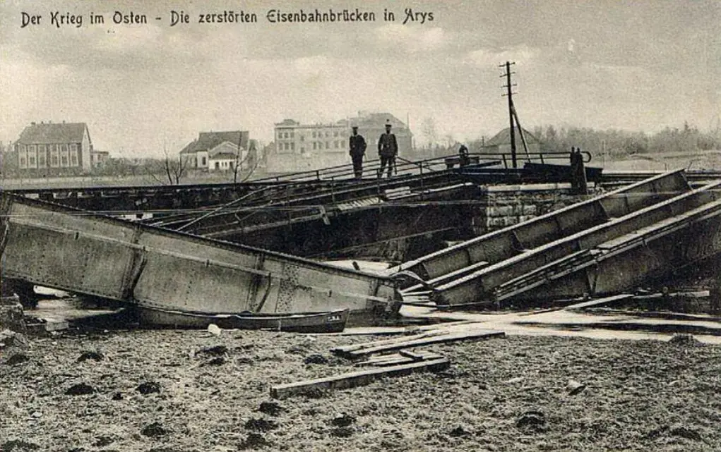 Zniszczone w toku działań wojennych mosty kolejowe w Orzyszu nad Orzyszą. W tle zabudowa miasteczka. Widok, najprawdopodobniej w kierunku wschodnim: w prawo perony, w lewo Ełk, Giżycko.