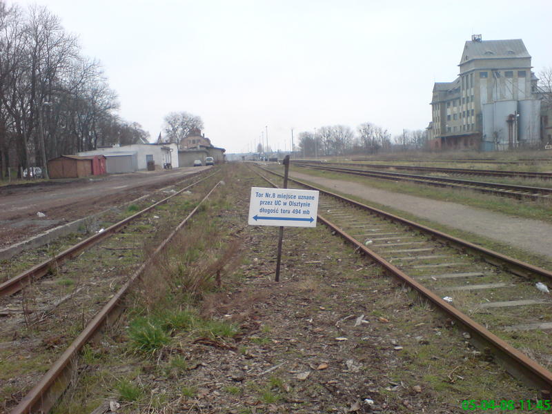 Widok w kierunku zachodnim: Olsztyn (prosto) i Wielbark/Ostrołęka (w lewo). Jak widać pociąg jadący z Ostrołęki zatrzymywał się na stacji, następnie lokomotywa wędrowała na tył składu i wtedy dopiero cały pociąg wyruszał do Olsztyna. Operacja ta trwała około 30 min.