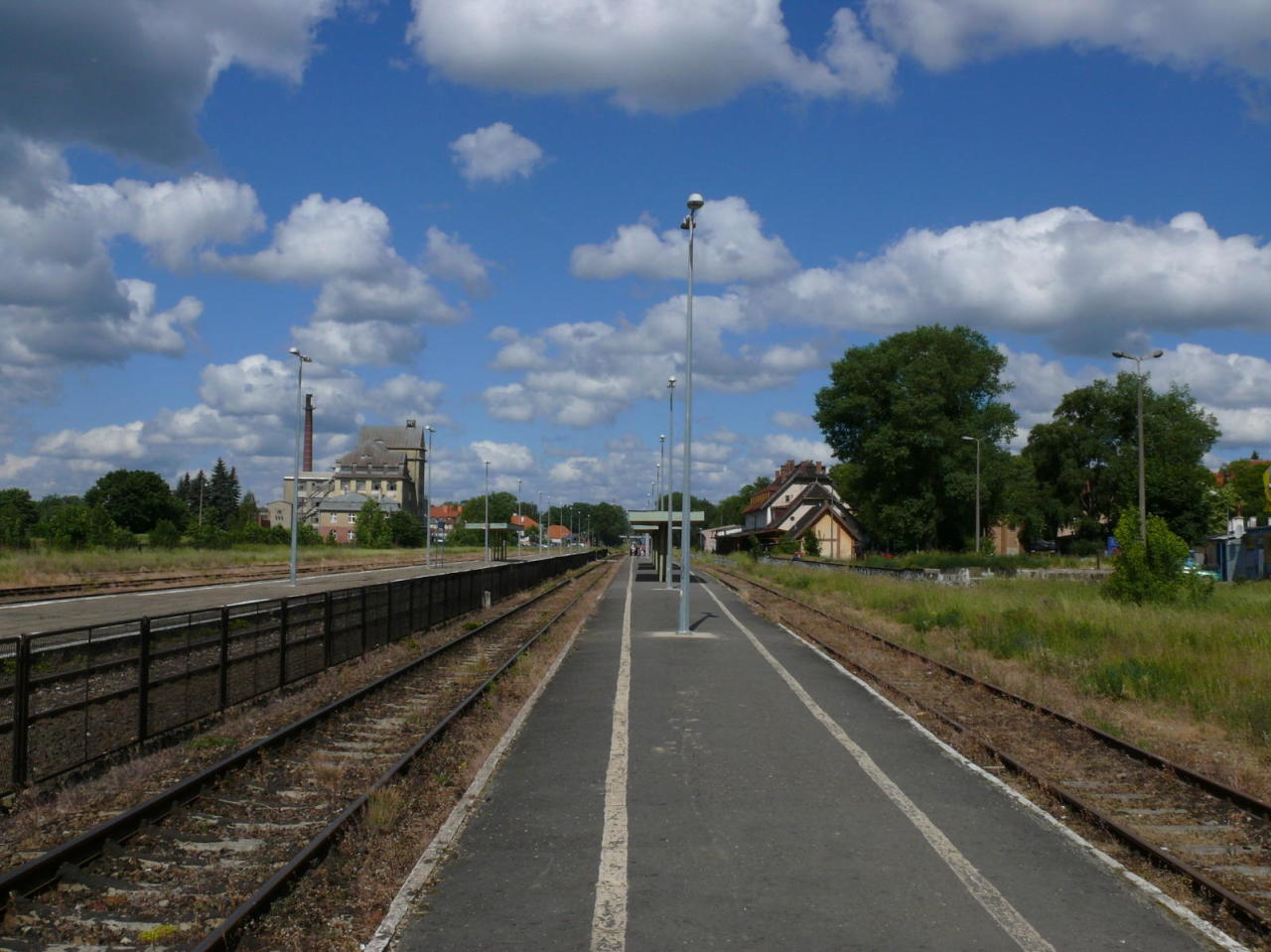 Widok na perony w kierunku zachodnim, od strony wjazdów z Pisza i Biskupca. W tle budynek dworca.