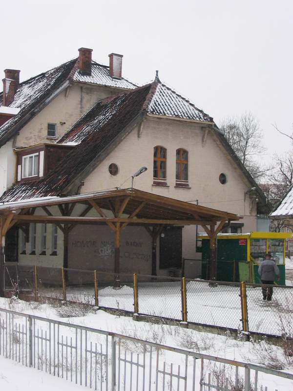 Część dworca szczycieńskiego zimą roku 2005. Ściana szczytowa od strony wjazdów z Pisza i Biskupca.