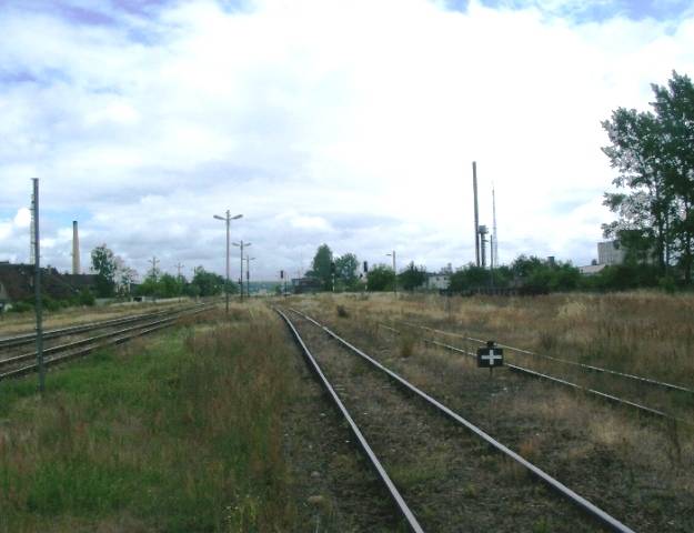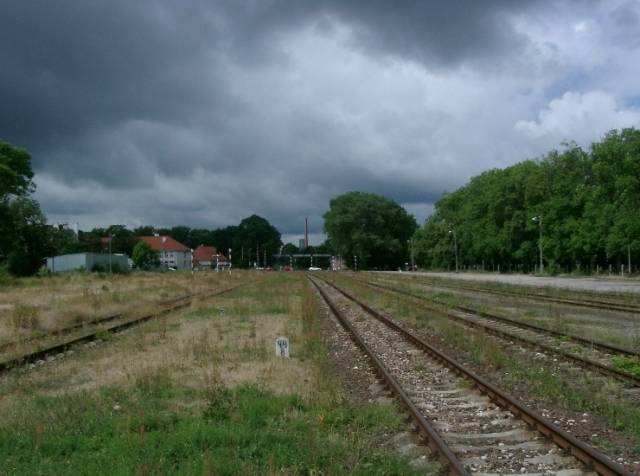 Szczytno. Z lewej plac przeładunkowy. W tle perony i dworzec. Widok w kierunku wschodnim, od strony wjazdów z Olsztyna i Wielbarku/Ostrołęki.