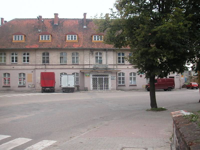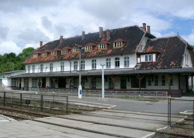 Niszczejący budynek dworca w Szczytnie. Widok od strony peronów w kierunku północno-wschodnim: w prawo Pisz/Ełk i Biskupiec, w lewo Olsztyn i Wielbark/Ostrołęka.