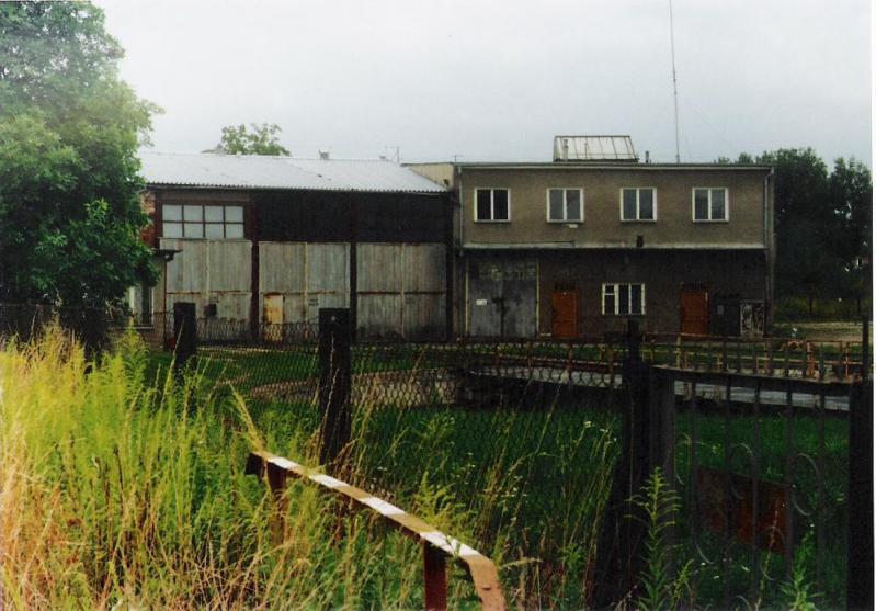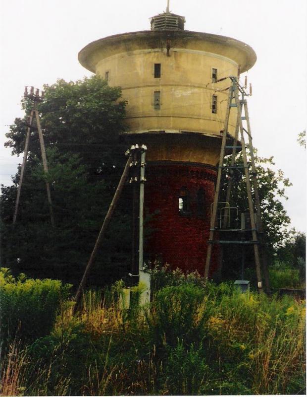 Wieża wodna stacji w Szczytnie istnieje - stan na wrzesień 2005. Na pierwszym planie fragment toru z Wielbarka/Ostrołęki (z lewej). Widok w kierunku północno-zachodnim: w prawo perony.