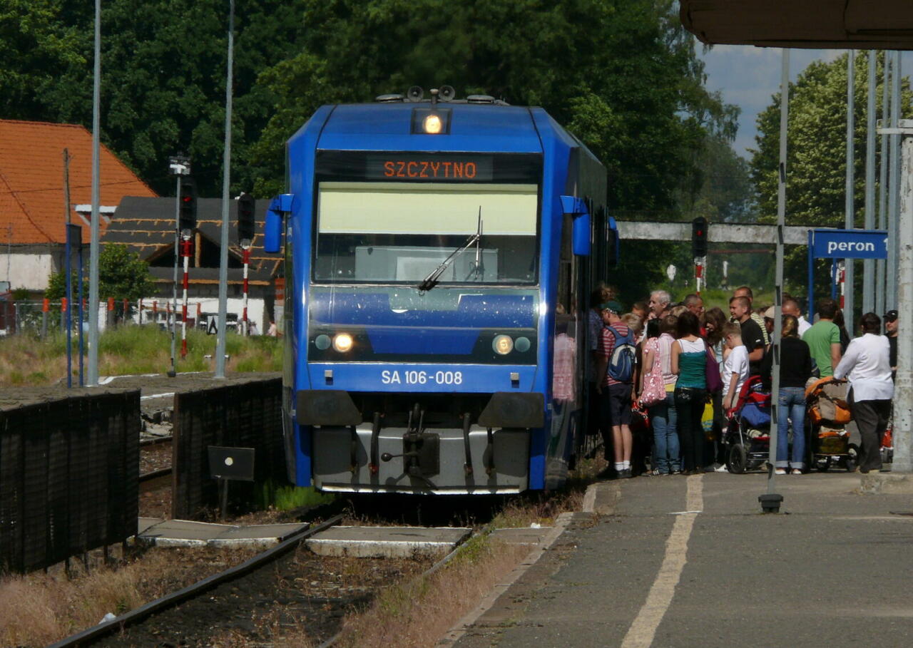 Szynobus na stacji w Szczytnie. Widok w kierunku zachodnim: Olsztyn, Wielbark/Ostrołęka.
