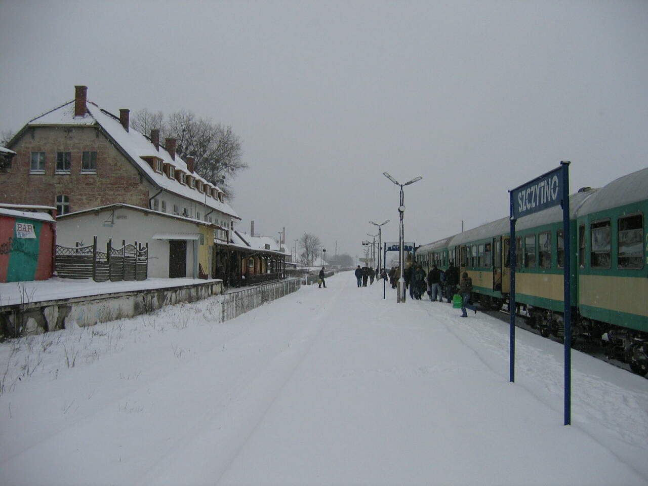 Budynek dworca w Szczytnie od strony peronów Kasa czynna tylko na 30 minut przed odjazdem pociągu. Pociągi kursują na trasie Olsztyn - Pisz. Widok w kierunku północnym: w prawo Pisz/Ełk i Biskupiec, w lewo Olsztyn i Wielbark/Ostrołęka.